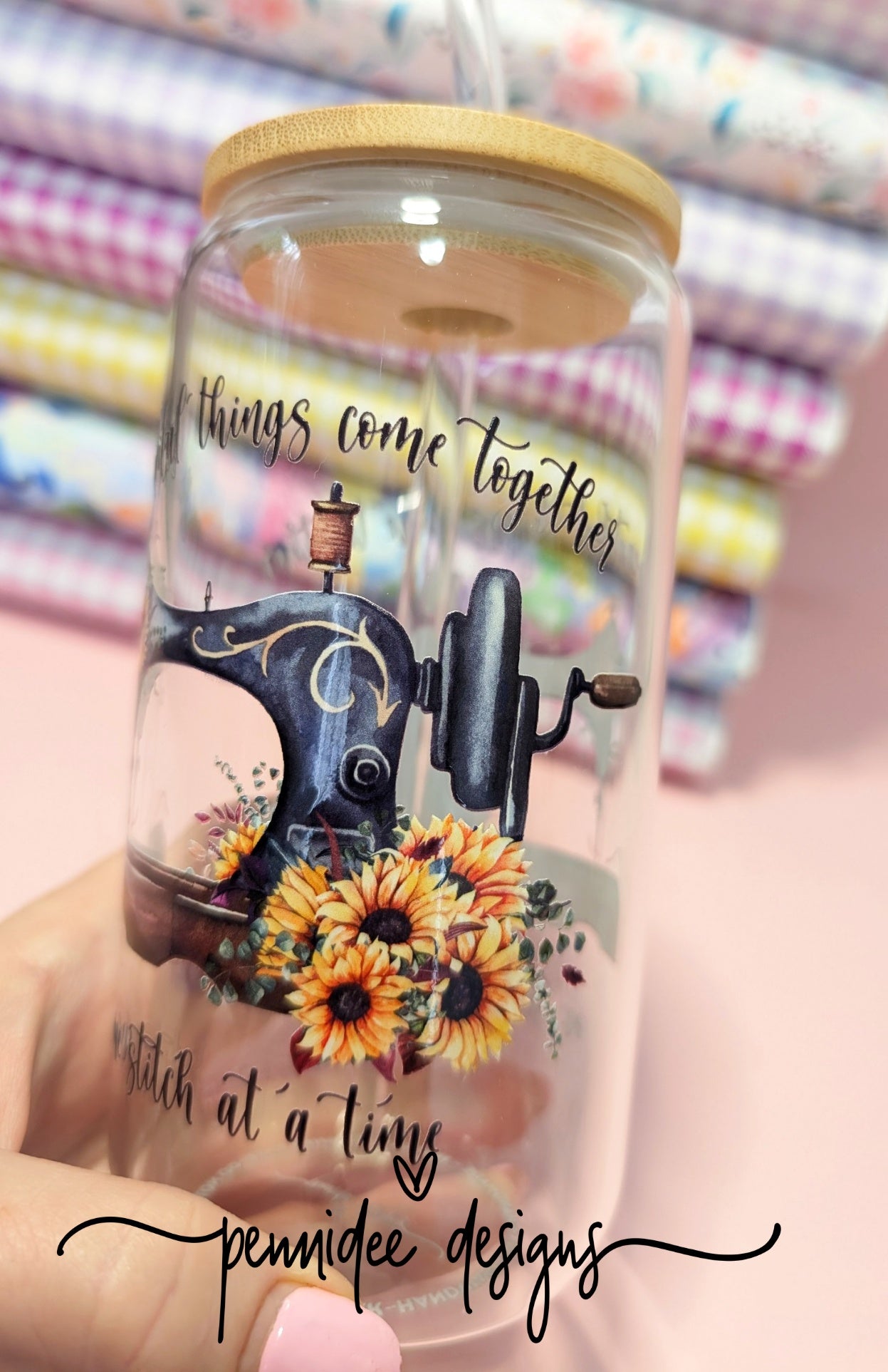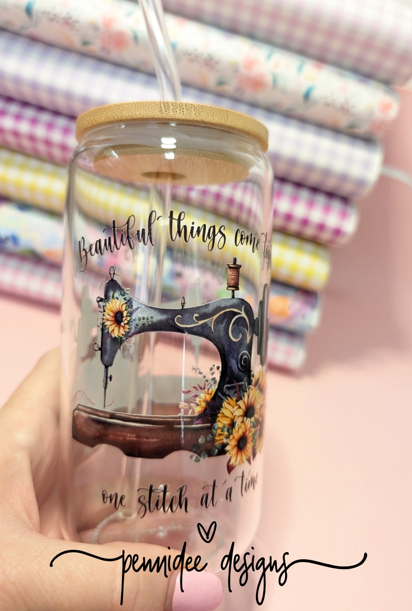 Experience the indulgence of sipping on a delicious and refreshing iced coffee, a flavourful iced tea, or a rejuvenating glass of cold water infused with fresh fruit slices in our Beautiful Things Come Together one stitch at a time ~ 475ml (16oz) Libbey Glass Can.