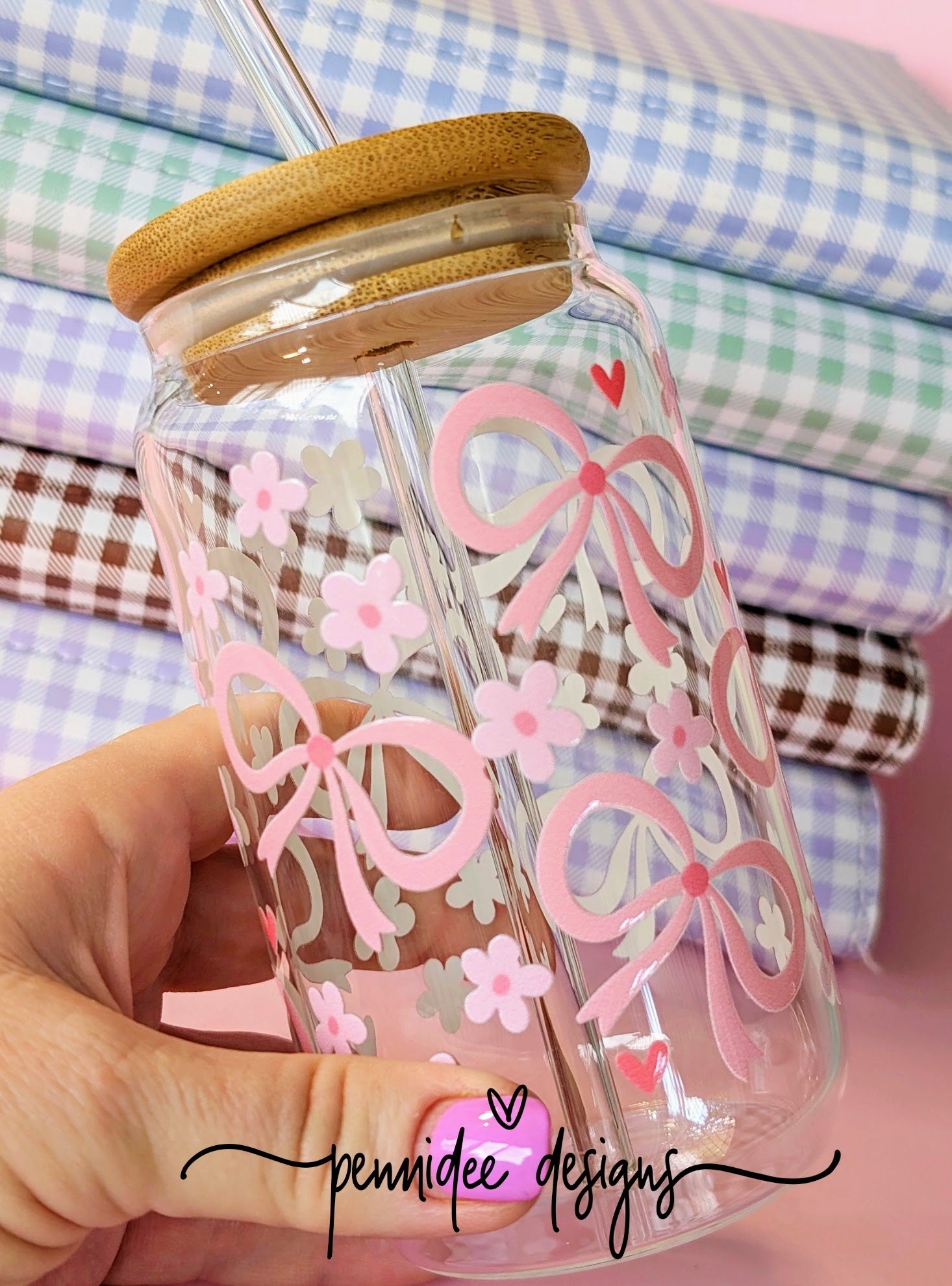 Pink Bows with Pink Flowers ~ 475ml (16oz) Libbey Glass Can